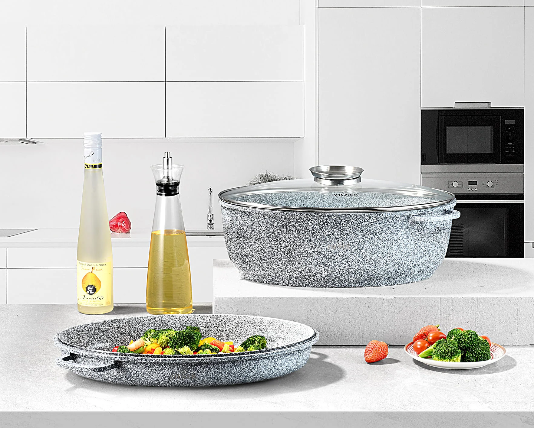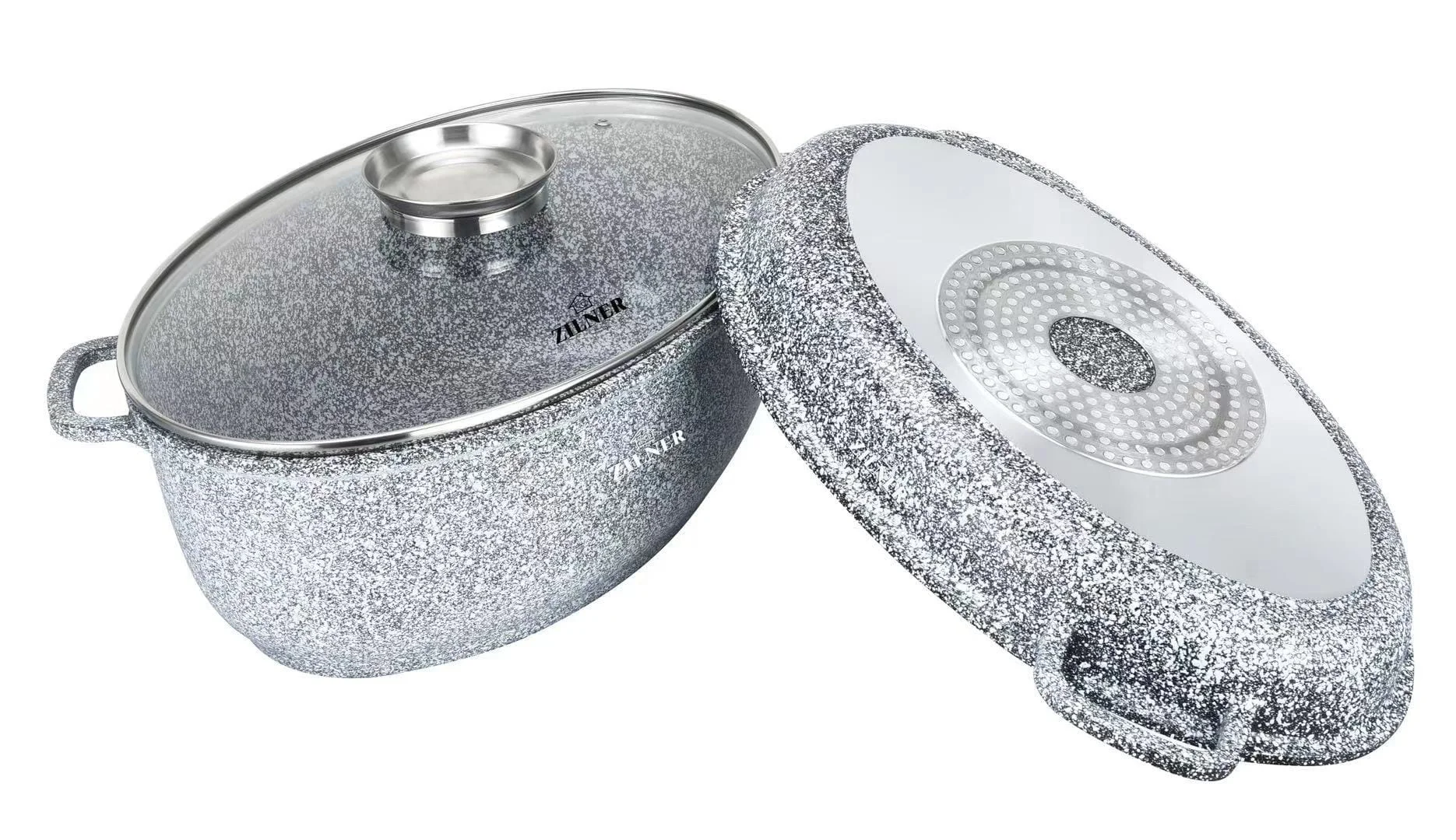 Brytfanna ceramiczno-marmurowa ZL- 1111 to klucz do odkrycia sekretów doskonałego pieczenia. Składa się z głębokiego naczynia o optymalnej średnicy i wysokości oraz solidnej, żaroodpornej pokrywy, zapewniając komfort podczas wkładania składników oraz kontrolowania procesu pieczenia. Dzięki specjalnej, 5-warstwowej konstrukcji szybko się nagrzewa i doskonale utrzymuje ciepło, co przekłada się na oszczędność energii.
